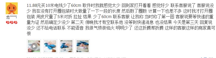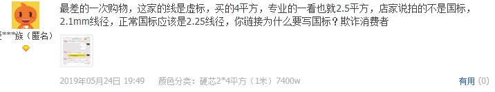評價(jià)截圖有很多,我這邊就不一 一發(fā)出來了,總結(jié)幾個(gè)特征,冒充國標(biāo),截面積虛標(biāo),米數(shù)不足,導(dǎo)體斷線,鋁鍍銅,這個(gè)就是低價(jià)的本質(zhì),如果你是買回家當(dāng)擺設(shè)并且不怕刺鼻味的,盡可能多買點(diǎn),其余用途作為晾衣繩都怕斷。